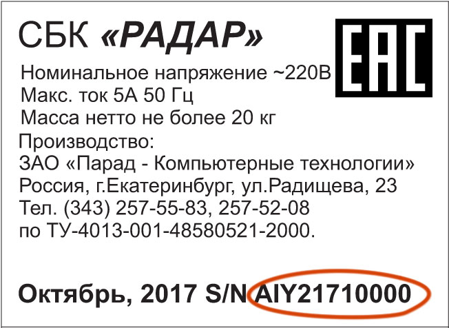 Уважаемые владельцы и пользователи компьютеров РАДАР, компания Парад выражает Вам признательность за выбор компьютера РАДАР, а также уверенность, что компьютер РАДАР будет Вам полезен в самом широком круге применений. Для запроса на техническую поддержку просим заполнить форму заявки и нажать кнопку «ОТПРАВИТЬ ЗАВКУ НА ТЕХНИЧЕСКУЮ ПОДДЕРЖКУ». Серийный номер вашего компьютера указан на этикетке, которая находится на тыльной стороне компьютера. Он выглядит так: